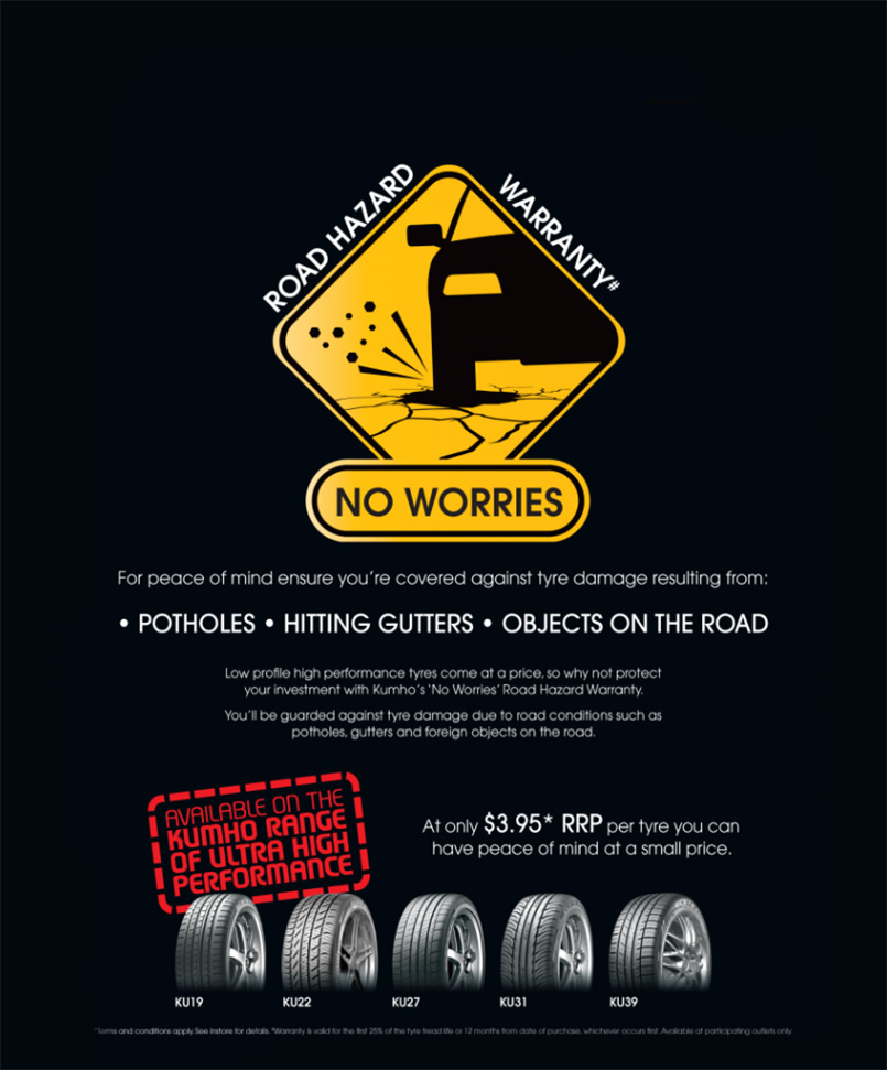 Introducing the Kumho Tyres Australia Mileage Guarantee for the Kumho Road Venture APT KL51 (80,000km) and the Road Venture SAT KL61 (60,000km) fitted to SUV, RV and 4×4 vehicles. As a global manufacturer of high tech tyre products, Kumho is so confident in its product it will guarantee you a specified mileage result for the Kumho Tyres you have just purchased.